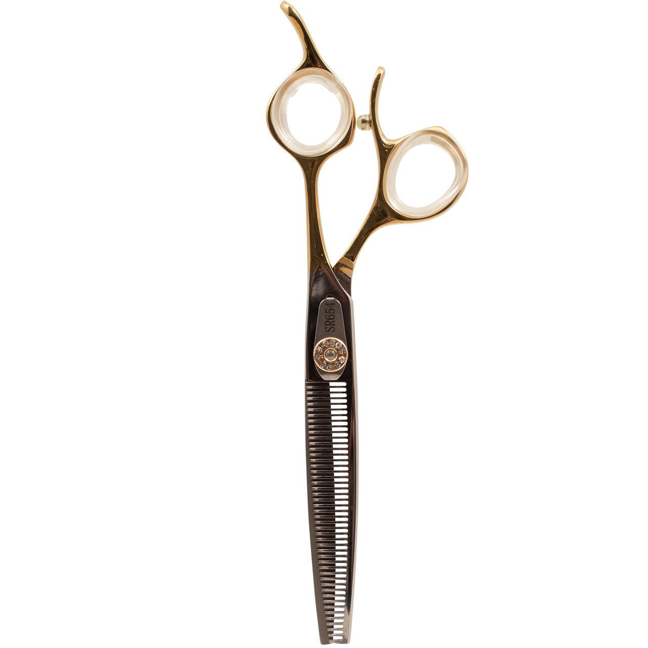 Introducing the 6.5″ Artisan Thinner, brought to you by the grooming professionals at Chris Christensen. As a member of the Artisan product line, this unique tool features a high-quality stainless steel blade with gold titanium and simulated-diamond accents.