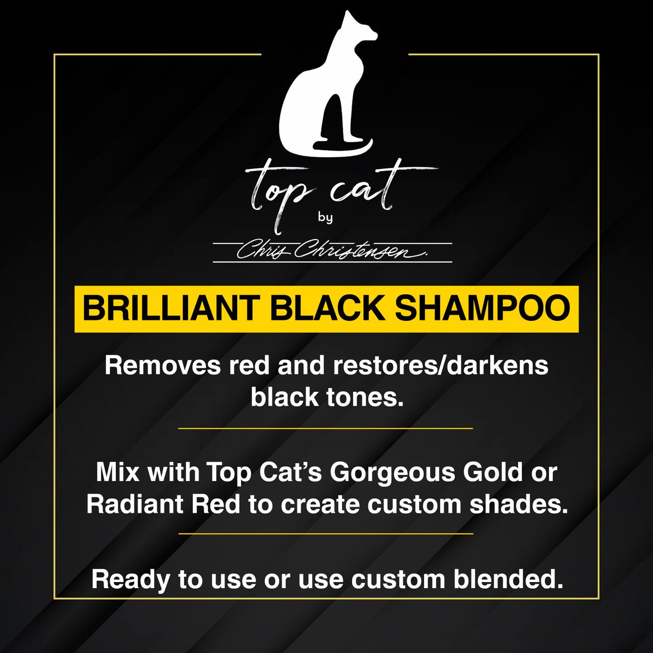 Chris Christensen Top Cat Brilliant Black Shampoo is an optic intensifying treatment. It removes red tones and darkens black tones without harsh chemicals. Brilliant Black Shampoo can be mixed with Gorgeous Gold or Radiant Red to create a custom color for your cat’s coat.