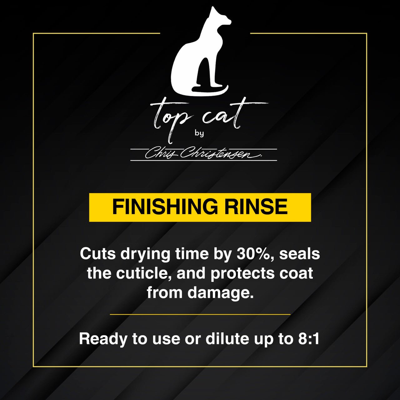 Chris Christensen Top Cat Finishing Rinse cuts down drying time by 30%, seals the cuticle and protects the coat from damage. Brushes and combs ease through the coat after using this zero residue formula. Finishing Rinse seals in all Top Cat treatments and manageability.